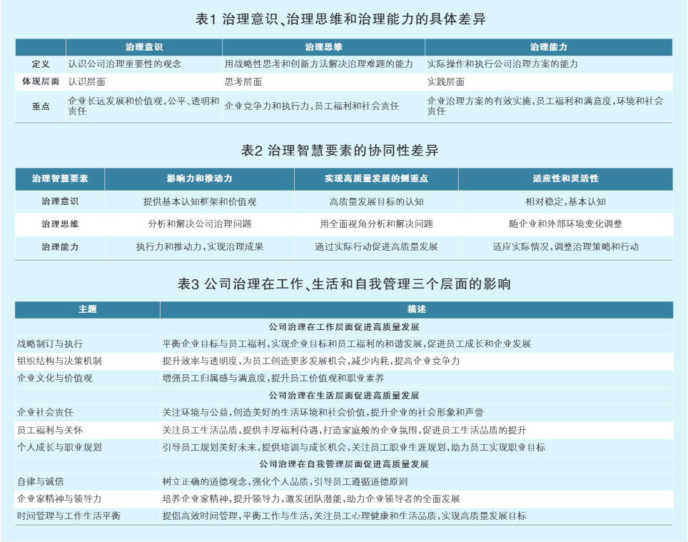 在实现企业高质量发展方面的侧重点差异上,治理意识使管理者明确治理重要性,为高质量发展指明方向;治理思维关注全面视角分析治理问题,运用战略性、系统性和创新性思维方式满足员工需求,为高质量发展提供动力;治理能力注重实际行动,推动高质量发展,为员工提供良好工作环境和福利。