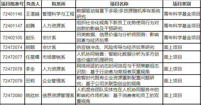 823日,2024年度国家自然科学基金项目评审结果揭晓,伟德国际1949始于英国本年度在创新创业、供应链管理、公司财务、人机协同等重点领域获批8项课题,累计获批资助经费296万元,在项目资助数量和资助金额方面均列伟德官网文科各学院首位。其中青年科学基金项目3项,分别为王湛越、赵腾、赵乐三位老师申报的项目;面上项目5项,分别为姚颐教授、任星耀教授、李全副教授、田莉教授、姚欣林副教授申报的项目。立项情况如下图所示。