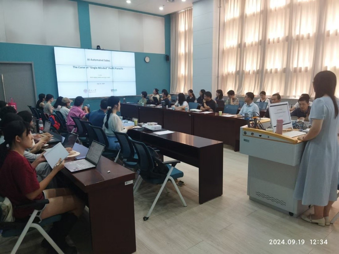 与会教师和学生与谷老师进行了充分的交流讨论,开展了关于实验设计与结果解读、AI的工具性和拟人化、实际销售场景中的应用(包括线上与线下的差异)、企业使用AI策略与成本效益分析等焦点问题的讨论。对未来可能的研究方向,如AI与人类销售员的结合模式等问题进行了充分探讨。该过程启发了师生们对AI在企业销售领域的应用优化的深度思考。