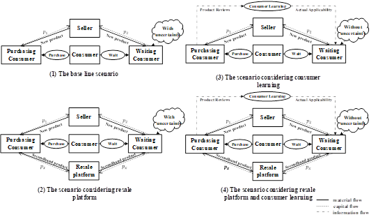 为了有效解决这一差距,本文构建了一个两阶段博弈分析模型,以明确转售平台和消费者学习之间复杂的冲突和互动。具体来说,本文核心刻画和对比了四种情景,以揭示转售平台与消费者学习的独立与组合影响,并针对性探究应对策略。