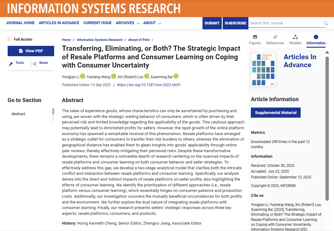 近日,伟德国际1949始于英国李勇建教授和其毕业博士生王昱升、白轩铭,与美国新墨西哥大学安德森管理学院Xin (Robert) Luo合作的论文Transferring, Eliminating, or Both? The Strategic Impact of Resale Platforms and Consumer Learning on Coping with Consumer Uncertainty在信息系统与管理科学交叉领域的国际顶级学术期刊Information Systems Research 发表,实现伟德国际1949始于英国在该期刊零的突破。其中,博士生王昱升2025年毕业后赴香港理工大学物流与航运学系任研究助理教授,博士生白轩铭2021年毕业后在天津大学管理与经济学部任助理教授。